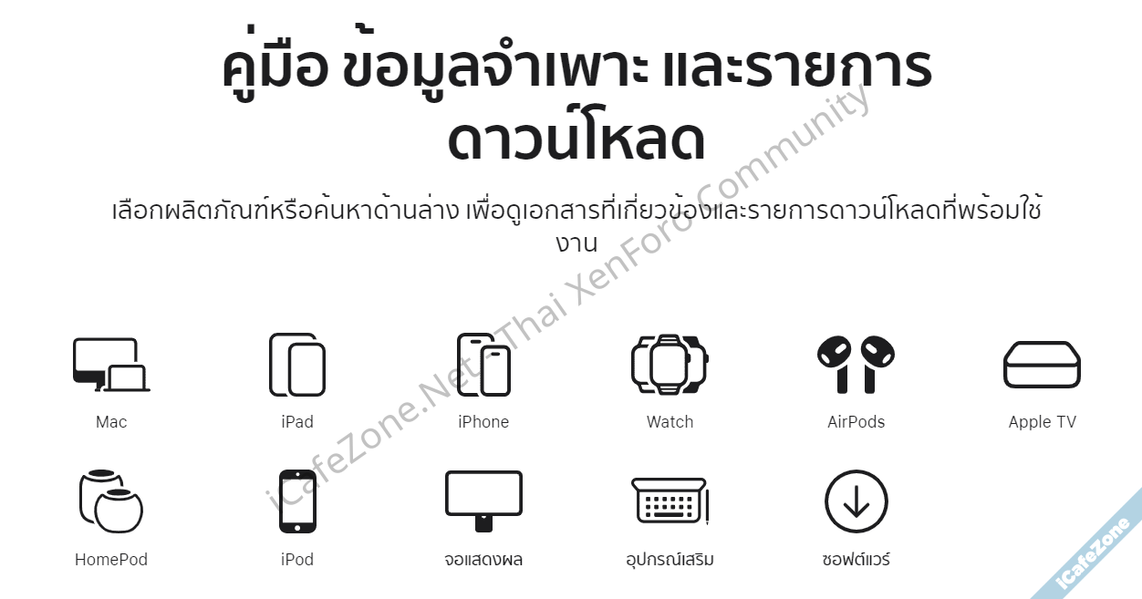 รายละเอียดสินค้าที่มีในหน้าเอกสารประกอบนี้ มีครบทั้ง Mac, iPhone, iPad, Apple Watch, AirPods, Apple TV, HomePod ไปจนถึง iPod, หน้าจอ, อุปกรณ์เสริม และซอฟต์แวร์