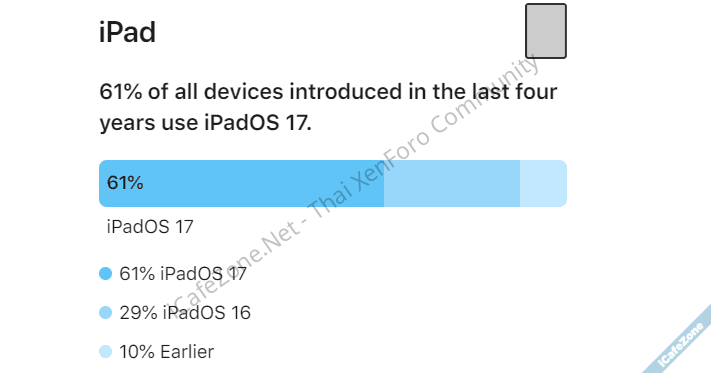 แอปเปิลยังรายงานตัวเลขของ iPadOS ด้วย โดย iPadOS 17 มีส่วนแบ่ง 61% เมื่อดูเฉพาะ iPad รุ่นใหม่ในช่วง 4 ปีที่ผ่านมา แต่ถ้านับรวมทั้งหมด iPadOS 17 มีส่วนแบ่งที่ 53%