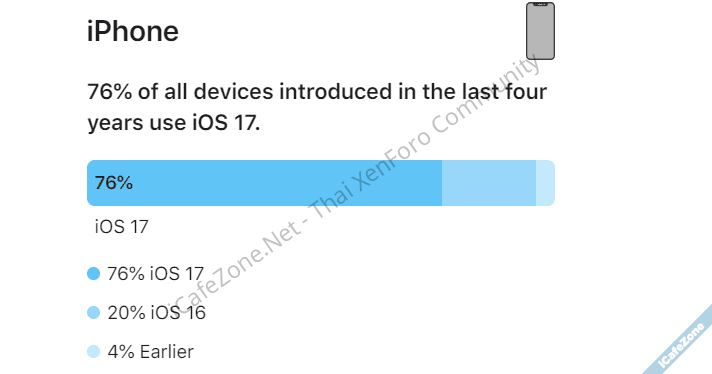 iOS 17 มีส่วนแบ่งผู้ใช้งาน 76% ของผู้ใช้ iPhone ทั้งหมดที่ขายในช่วง 4 ปีที่ผ่านมา ส่วน iOS 16 มี 20% หากนับรวม iPhone ทั้งหมดทุกรุ่น iOS 17 คิดเป็น 66% ตัวเลขนี้น้อยกว่าตอน iOS 16 ที่มีส่วนแบ่งถึง 81% ในระยะเวลาเดียวกัน