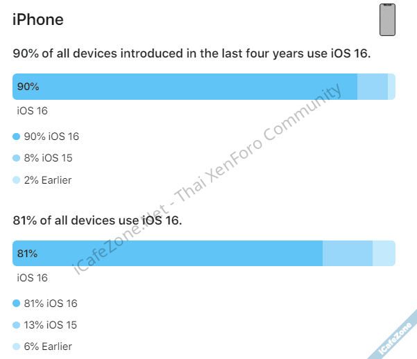 โดยข้อมูล ณ วันที่ 30 พฤษภาคม 2023 แอปเปิลระบุว่า 81% ของ iPhone ที่มีการใช้งานอยู่ตอนนี้ เป็นระบบปฏิบัติการ iOS 16 เพิ่มขึ้นจาก 72% ที่แอปเปิลรายงานในเดือนกุมภาพันธ์ เป็น iOS 15 13% ที่เหลือเป็นเวอร์ชันเก่ากว่านั้น และหากดูเฉพาะ iPhone รุ่นใหม่ที่เปิดตัวย้อนหลัง 4 ปี ส่วนแบ่ง iOS 16 อยู่ที่ 90%