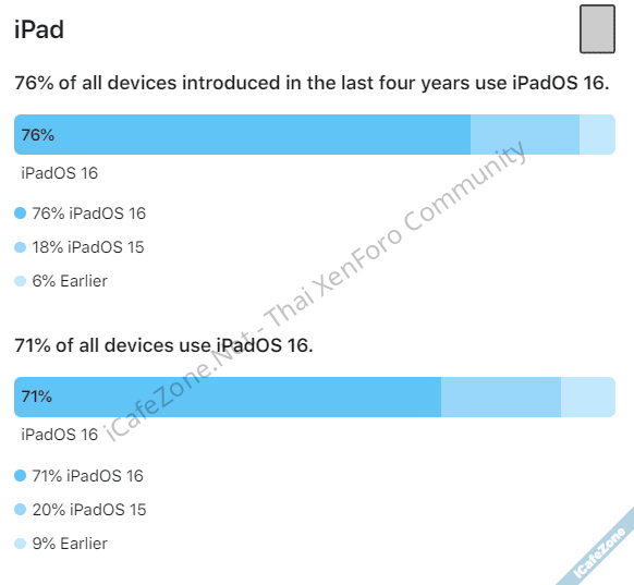 ส่วนตัวเลขของ iPad แตกต่างไปพอสมควร โดยภาพรวมของ iPad ทั้งหมด ใช้ระบบปฏิบัติการ iPadOS 16 ที่ 71% เพิ่มขึ้นจากเดือนกุมภาพันธ์ซึ่งอยู่ที่ 50% เป็น iPadOS 15 ที่ 20% ที่เหลือเป็นเวอร์ชันเก่ากว่านั้น หากวัดเฉพาะ iPad รุ่นที่เปิดตัวย้อนหลังใน 4 ปี ส่วนแบ่ง iPadOS 16 อยู่ที่ 76%