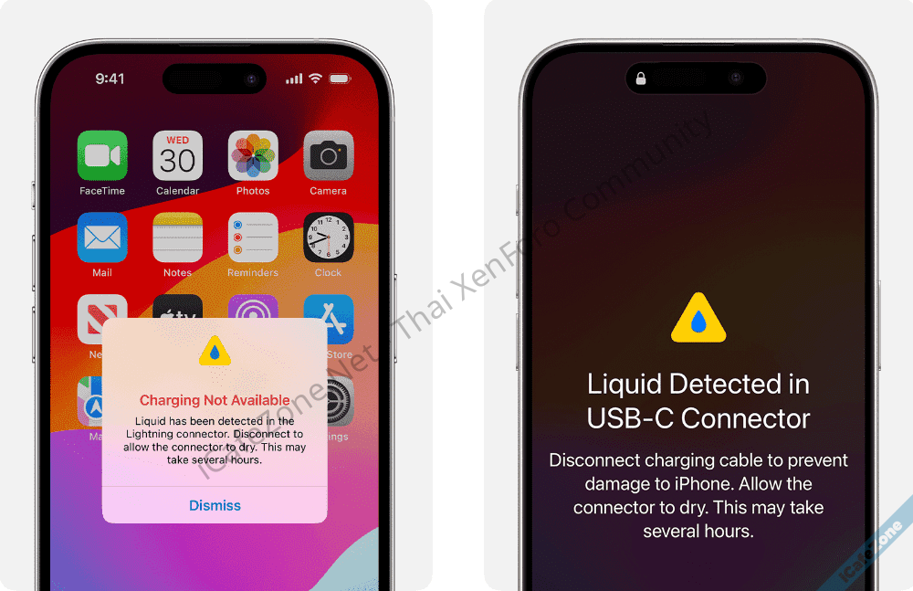 แอปเปิลบอกว่าในกรณีผู้ใช้งานพบคำเตือนตรวจจับของเหลวที่ขั้วต่อชาร์จ ทั้ง Lightning หรือ USB-C ทำให้ไม่สามารถชาร์จได้เพื่อความปลอดภัย คำแนะนำก็คือหยุดชาร์จ และทำให้อุปกรณ์แห้งก่อน ซึ่งวิธีที่แอปเปิลแนะนำคือ เคาะ คว่ำ ให้ของเหลวออก, นำไปไว้ที่อากาศถ่ายเท ประมาณ 30 นาที ถ้ายังพบคำเตือนก็ให้ทำซ้ำ โดยอาจทิ้งไว้ระดับข้ามคืน หรือ 24 ชั่วโมง ถ้าทำทั้งหมดนี้แล้วยังไม่หาย ควรติดต่อ Apple Support เพื่อรับคำแนะนำต่อไป