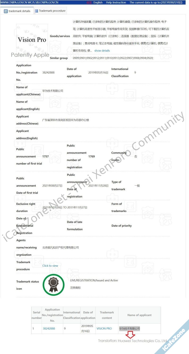 HuaweiCentral (HC) Newsroom เปิดเผยว่า HUAWEI เคยจดเครื่องหมายการค้า Vision Pro หมายเลขจดทะเบียน 38242888 ไว้ตั้งแต่ปี 2019 ซึ่งอาจทำให้ Apple ต้องทำการเปลี่ยนชื่อผลิตภัณฑ์ในประเทศจีน