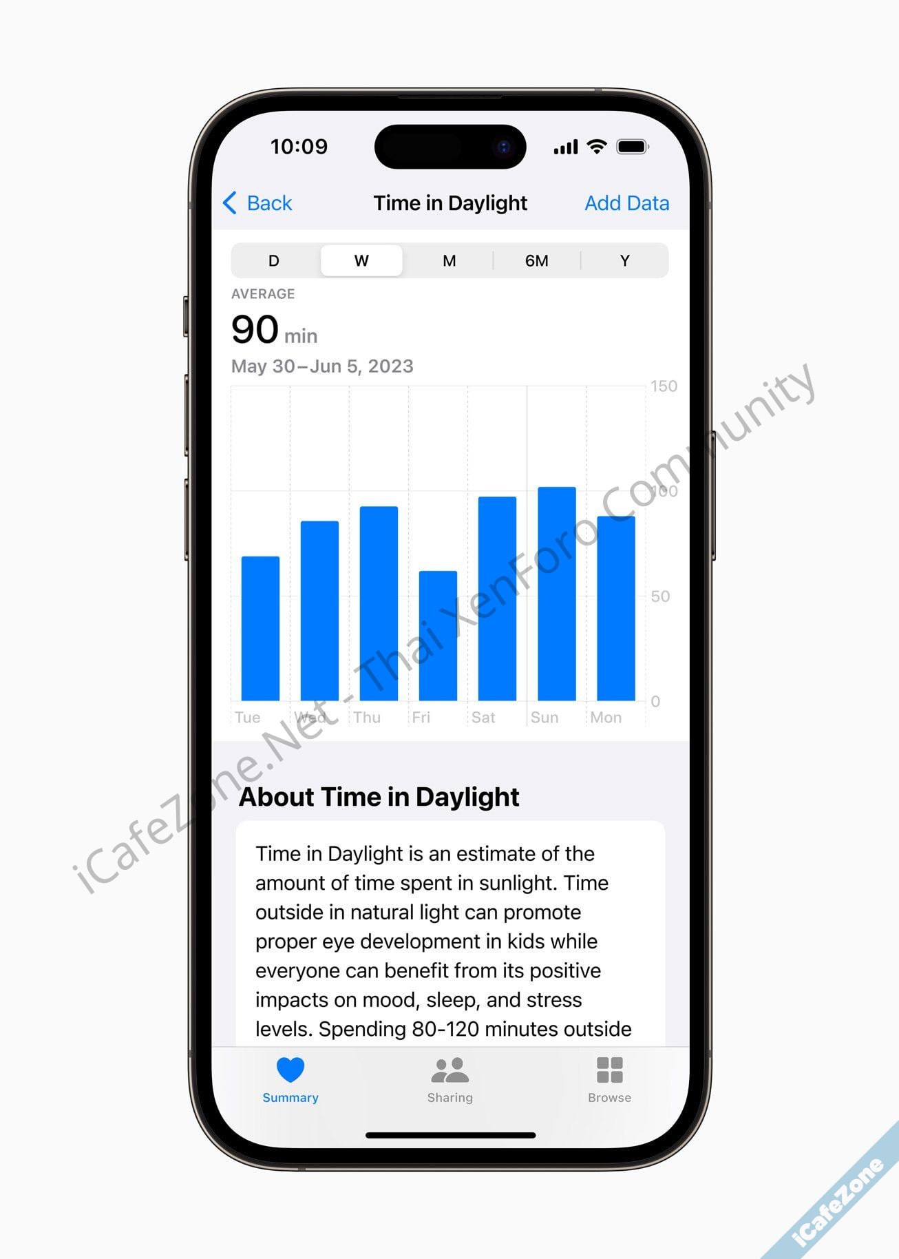ฟีเจอร์สุขภาพสายตา ผู้ใช้สามารถดูจำนวนเวลาที่อยู่กลางแจ้ง ซึ่งตรวจจับได้จาก Apple Watch โดยการใช้เวลากลางแจ้งจะสามารถช่วยลดความเสี่ยงในการเกิดภาวะสายตาสั้น