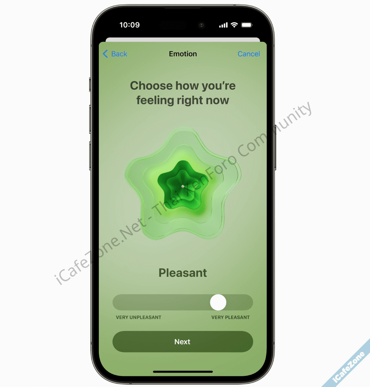 - ฟีเจอร์สุขภาพจิต สามารถบันทึกอารมณ์ระหว่างวันและประจำวันได้ เช่น ความรู้สึกกังวลใจ, โกรธ, เครียด เป็นต้น โดยการบันทึกอารมณ์จะช่วยให้เพิ่มความตื่นตัวทางความรู้สึกและเป็นประโยชน์ต่อการประเมินภาวะซึมเศร้าหรือการรักษาทางการแพทย์อื่นได้ ใช้ได้ทั้งใน iPhone, iPad และ Apple Watch