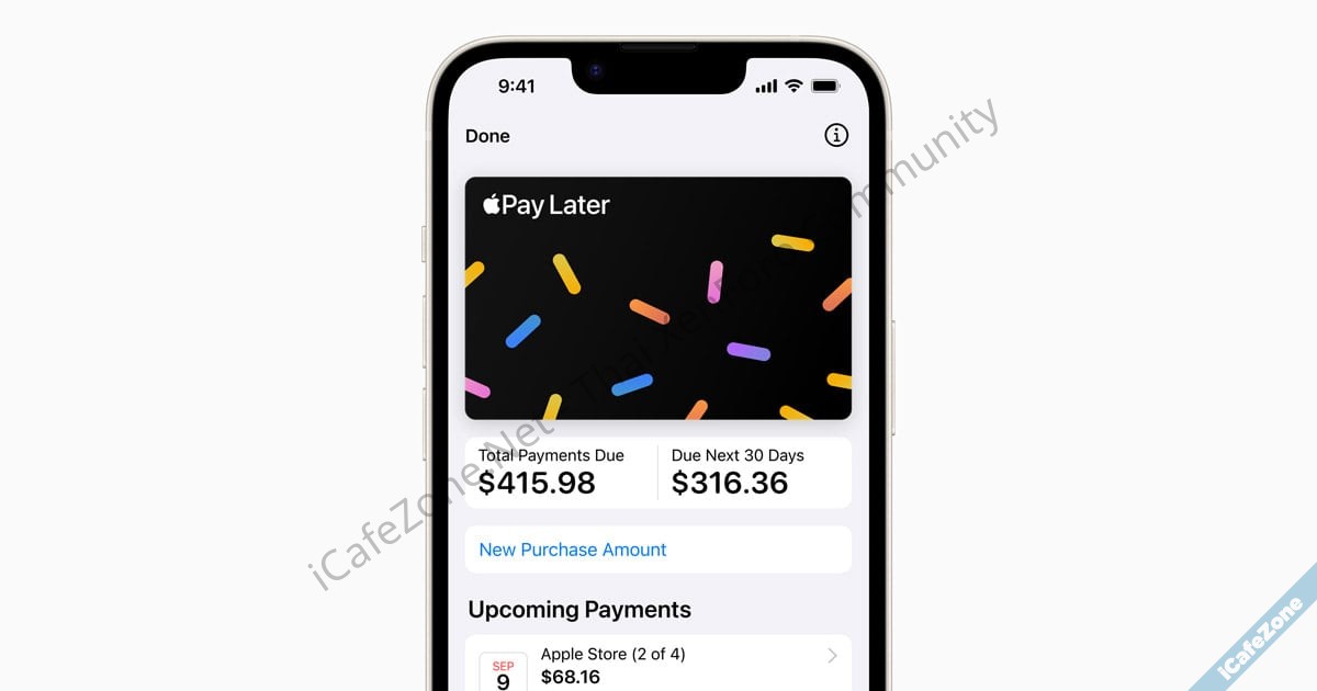 Apple Pay Later ให้ลูกค้าสามารถแบ่งจ่ายทุกรายการซื้อออกเป็น 4 งวด ภายในระยะเวลา 6 สัปดาห์ ไม่มีดอกเบี้ยและค่าธรรมเนียม สามารถจัดการรายการต่าง ๆ ได้ผ่านแอป Apple Wallet วงเงินสินเชื่อเริ่มต้นที่ 50 ดอลลาร์ ถึง 1,000 ดอลลาร์ ขั้นตอนการผ่อนจ่ายและควบคุมวงเงินเครดิตดูแลโดยธนาคาร Goldman Sachs ผ่านระบบของ Mastercard