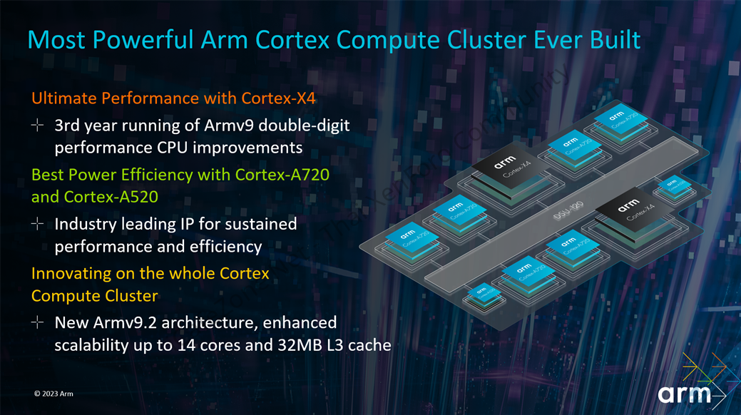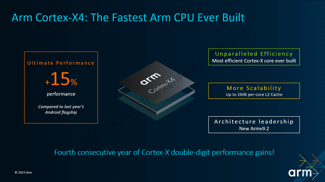 - Cortex-X4 คอร์ตัวใหญ่สุด ประสิทธิภาพเพิ่มขึ้น 15%, การใช้พลังงานดีขึ้น 40% เทียบกับ Cortex-X3