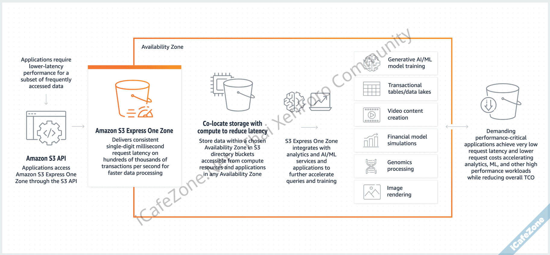 เหตุผลที่ส่งข้อมูลได้เร็วเป็นเพราะข้อมูลทั้งหมดในสตอเรจจะถูกเก็บไว้บนฮาร์ดแวร์ที่อยู่ใน Availability Zone เดียวกัน (ตามชื่อ One Zone) ช่วยลด latency ในการเรียกข้อมูลลงได้มาก