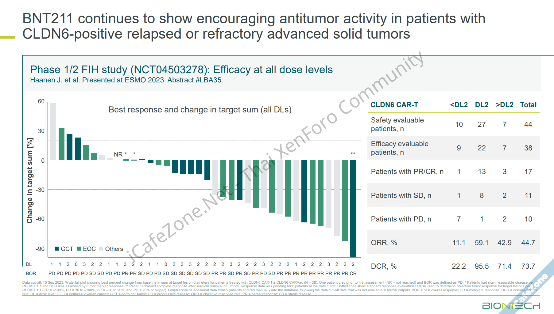 BioNTech ผู้พัฒนาวัคซีน mRNA รายใหญ่ประกาศผลเบื้องต้นของวัคซีน BNT211 ที่เป็นวัคซีนรวมสองเทคนิค คือ cell therapy ด้วย CAR-T cell สำหรับจับ antigen CLDN6 ที่พบได้ในเซลล์มะเร็งหลายประเภท และวัคซีน CARVac ที่ช่วยยืดระยะเวลาการจับเซลล์มะเร็งเพื่อขจัดออกจากร่างกาย โดยผลการตอบสนองการรักษาโดยรวม (overall response rate - ORR) อยู่ที่ 59% และอัตราการคุมโรค (disease control rate - DCR) อยู่ที่ 95%