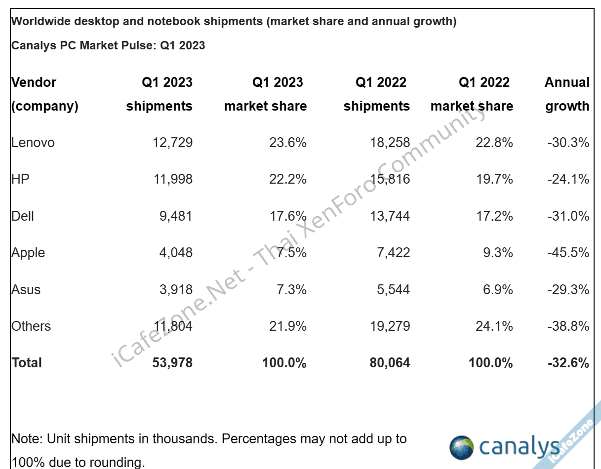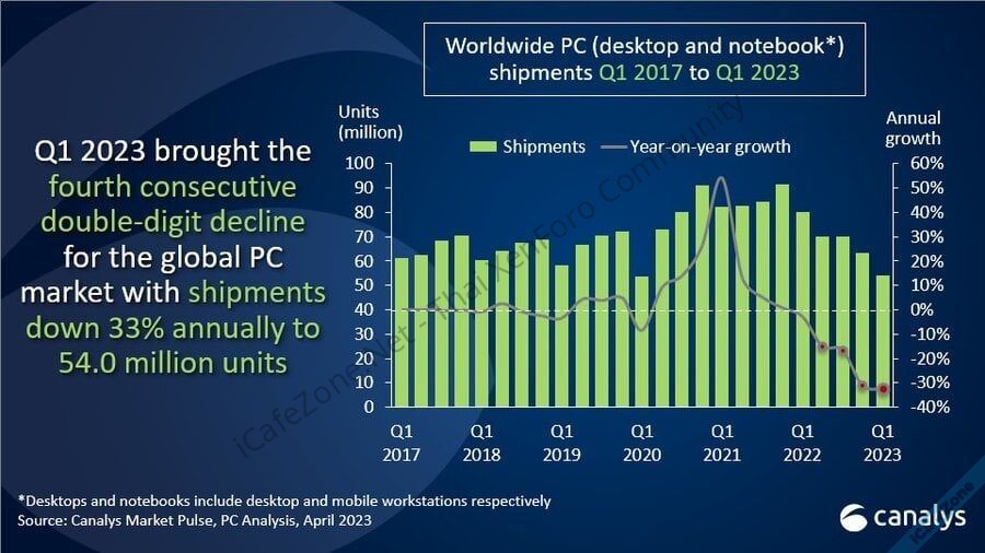 บริษัทวิจัยตลาด Canalys ออกรายงานยอดขายพีซีช่วงไตรมาส 1/2023 หดตัวลง -32.6% สอดคล้องกับตัวเลขของ IDC ในข่าวก่อนหน้านี้ที่หดตัว 29%