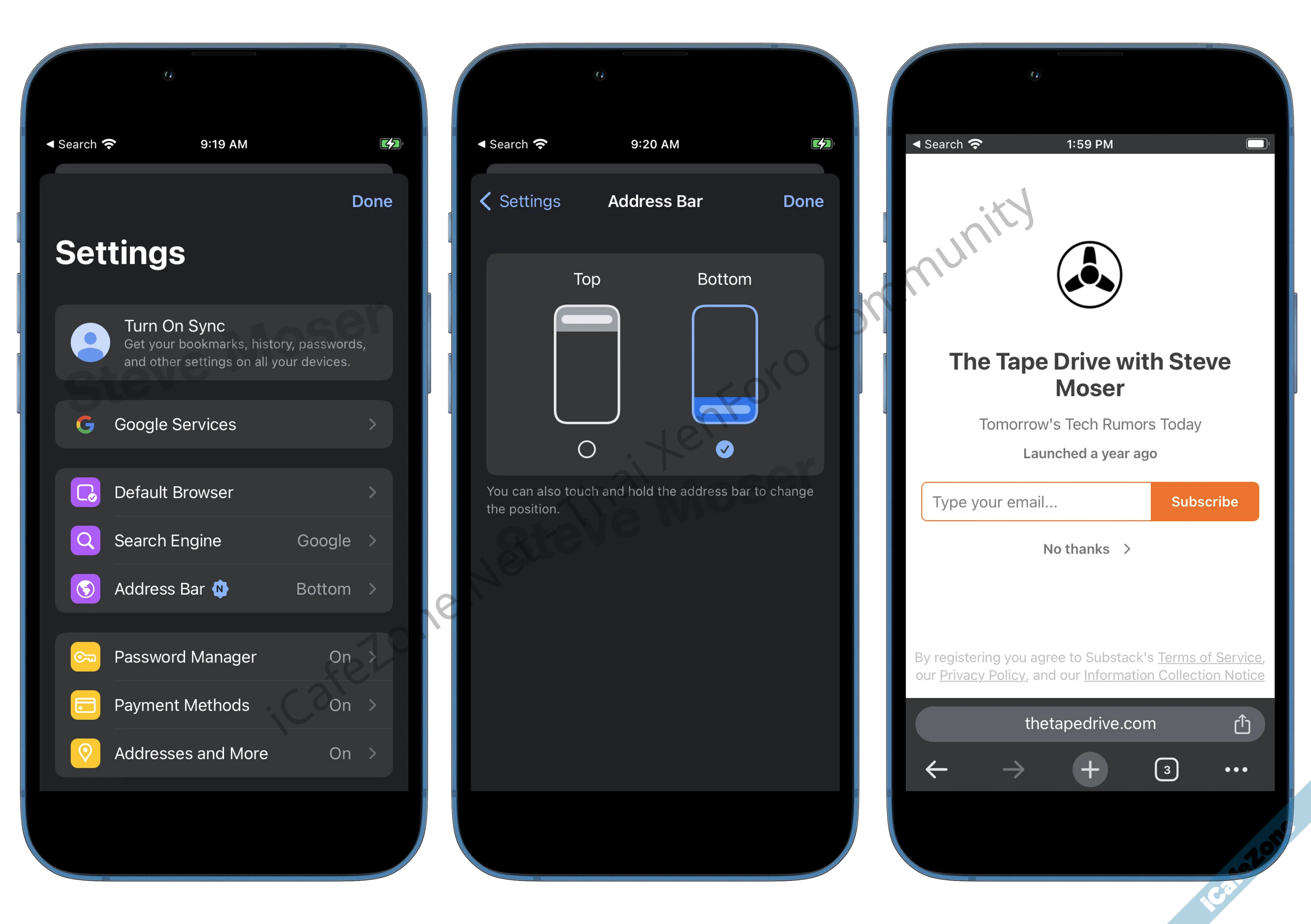 ผู้ใช้งานพบ Chrome Beta สำหรับ iOS เพิ่มตัวเลือกย้ายตำแหน่ง address bar ไปไว้ที่ด้านล่างของหน้าจอแล้ว เดิมทีแถบดังกล่าวจะอยู่บริเวณด้านบนของหน้าจอ ทำให้ผู้ใช้งานต้องเอื้อมนิ้วไปกด ซึ่งเว็บเบราว์เซอร์อื่น ๆ รวมถึง Safari เอง ก็ได้แก้ปัญหานี้ด้วยการย้าย address bar มาไว้ด้านล่างจอกันมานานแล้ว