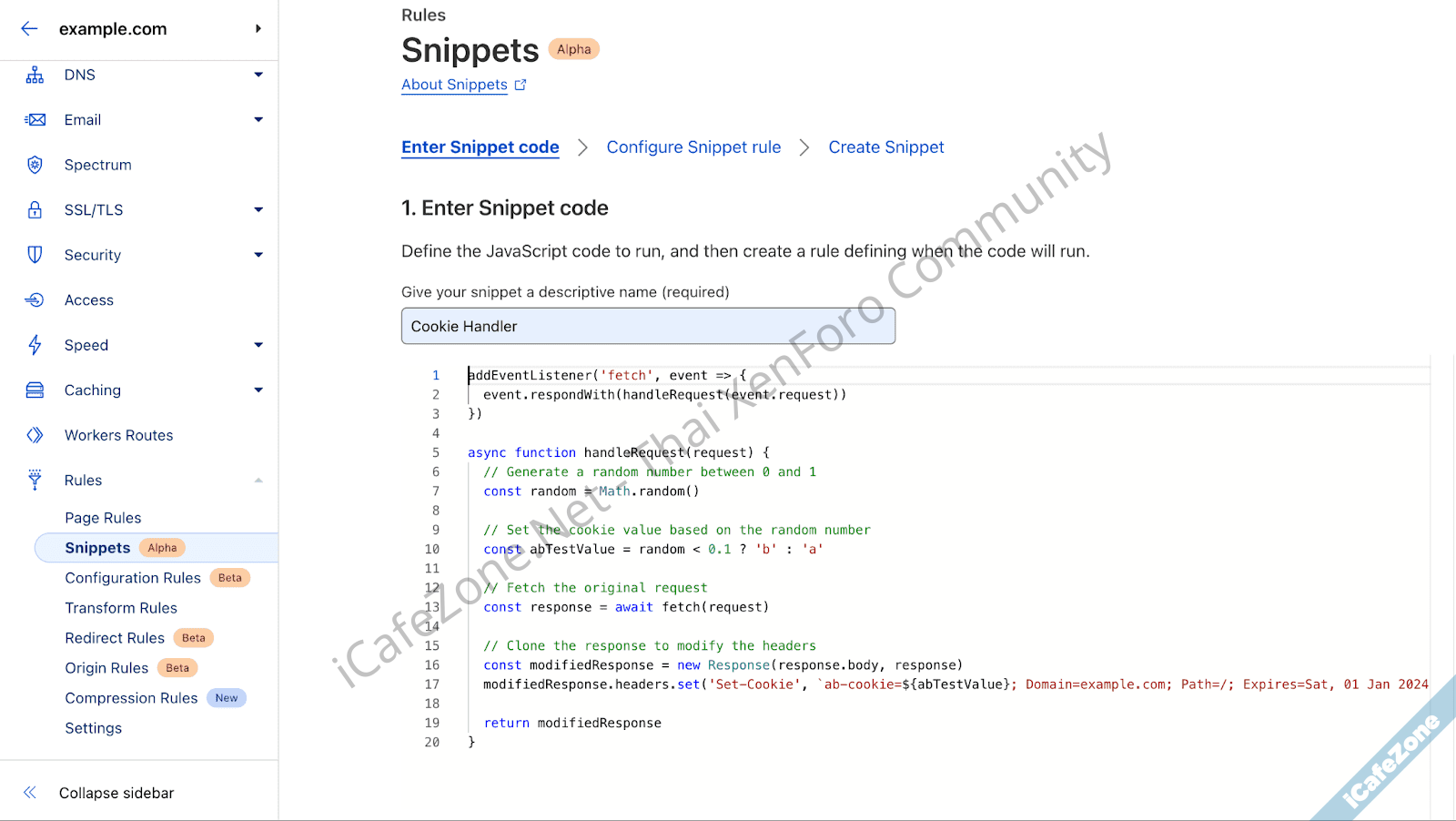 แม้ว่าจะคล้ายกับ Workers มาก แต่ Snippets จำกัดโค้ดขนาดไม่เกิน 32KB เท่านั้น และเมื่อรันแล้วต้องกินหน่วยความจำไม่เกิน 2MB ใช้เวลารันไม่เกิน 5ms นับว่าเล็กมาก ไม่เหมาะกับการรันงานซับซ้อนใดๆ ข้อดีสำคัญคือ Snippets นั้นไม่คิดค่ารัน แต่จำกัดจำนวนโค้ดที่ใส่ได้ แพ็กเกจฟรีใส่ได้ 5 ชุดต่อโซน ขณะที่แพ็กเกจใหญ่ขึ้นจะใส่โค้ดได้หลายชุดขึ้น