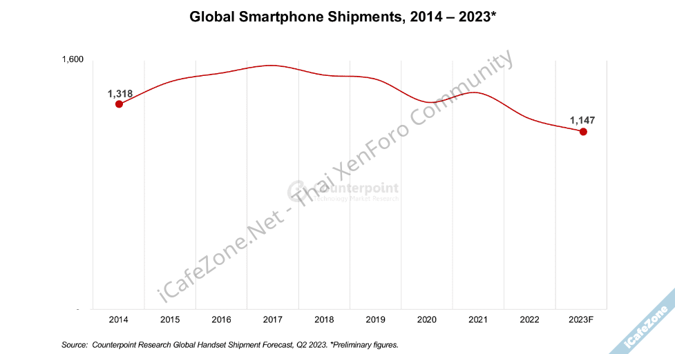 บริษัทวิจัยตลาด Counterpoint Research คาดการณ์จำนวนส่งมอบสมาร์ทโฟนทั่วโลกประจำปี 2023 จะอยู่ที่ 1,147 ล้านเครื่อง ลดลง 6% จากปี 2022 ซึ่งมีประเด็นสำคัญคือเป็นตัวเลขที่น้อยที่สุดในรอบ 10 ปี