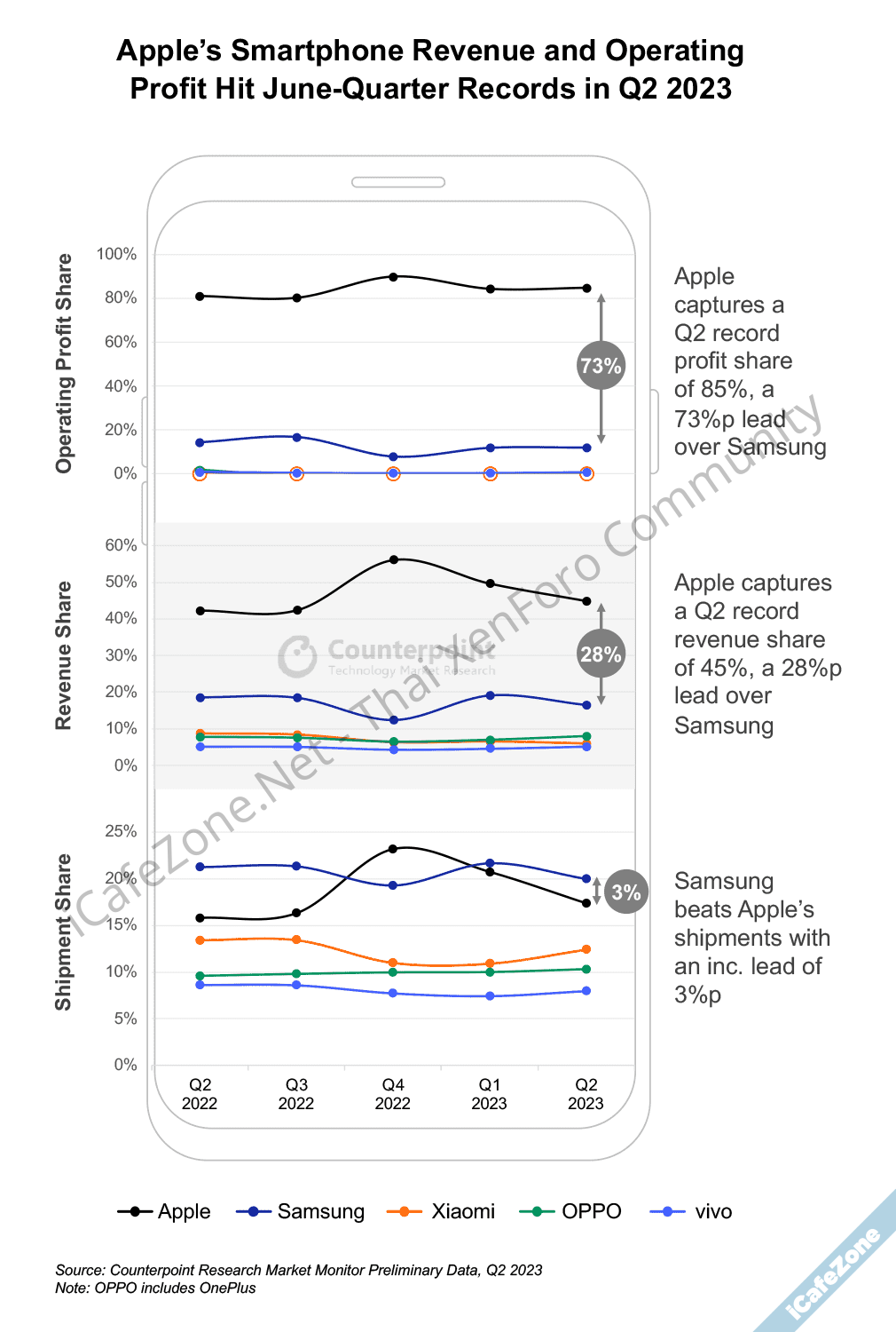 แอปเปิลยังรักษาส่วนแบ่งรายได้ในระดับที่สูง แม้รายได้จาก iPhone ในไตรมาสที่ผ่านมาจะลดลง โดยมีส่วนแบ่งตลาดรวมที่ 45% ส่วนกำไรจากการดำเนินงานเพิ่มเป็นระดับ 85% ของผู้ผลิตทั้งหมด