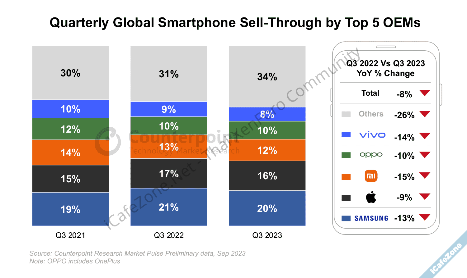 Counterpoint Research ออกรายงานยอดขายสมาร์ทโฟนไตรมาส 3/2023 ภาพรวมตลาดยังหดตัว 8% จากไตรมาสเดียวกันของปีก่อน แต่โตขึ้นเล็กน้อย 2% จากไตรมาส 2/2023