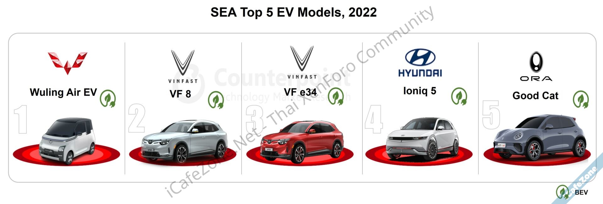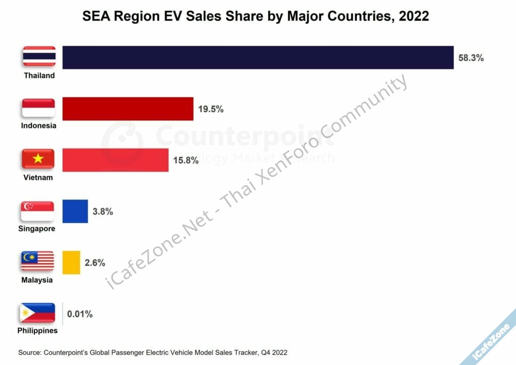 บริษัทวิจัยตลาด Counterpoint รายงานข้อมูลยอดขายรถยนต์ไฟฟ้าส่วนบุคคล (EV) ในภูมิภาคเอเชียตะวันออกเฉียงใต้ ของปี 2022 โดยภาพรวมรถยนต์กลุ่ม EV มียอดขายคิดเป็น 2% ของรถยนต์ทั้งหมดที่ขายได้ ซึ่งมีคิดส่วนแบ่งรายประเทศ พบว่าไทยมีการซื้อรถยนต์ EV มากที่สุดถึง 58% ของรถยนต์ EV ทั้งหมด ตามด้วยอินโดนีเซียที่ 19.5% และเวียดนาม 15.8% ตัวเลขเป็นทิศทางเดียวกับรายงานก่อนหน้านี้ของไตรมาส 3/2022