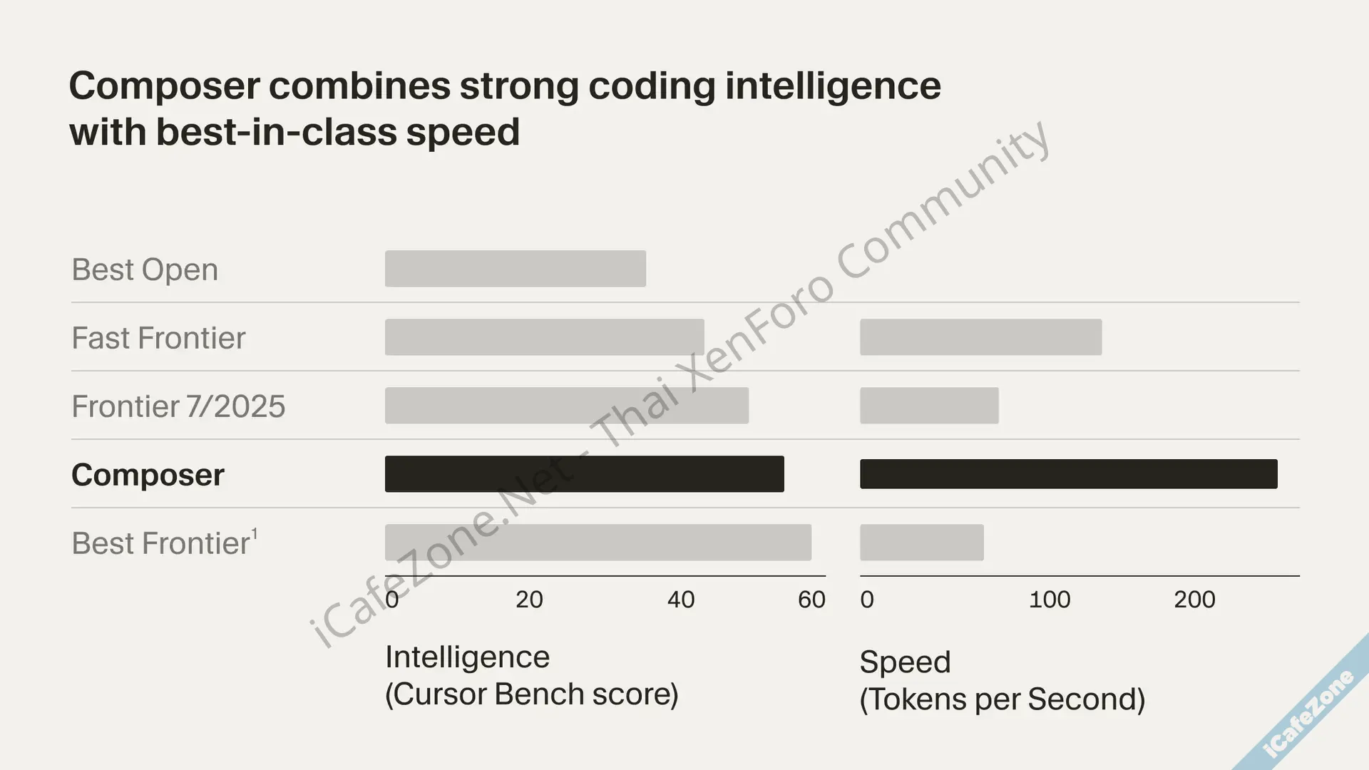 Anysphere บอกว่าโมเดล Composer มีความเร็วเพิ่มขึ้น 4 เท่า เมื่อเทียบกับโมเดลกลุ่มเดียวกัน เพราะออกแบบมาเพื่อคำนึงถึงความเร็วในการตอบสนอง (latency) โดยยังรักษาคุณภาพของผลลัพธ์ด้านการเขียนโค้ดเอาไว้ในระดับใกล้เคียงกับโมเดลรุ่นท็อปสุด (GPT-5 และ Sonnet 4.5 ที่ยังทำผลลัพธ์ได้ดีกว่า Composer แต่ตอบช้ากว่ามาก)