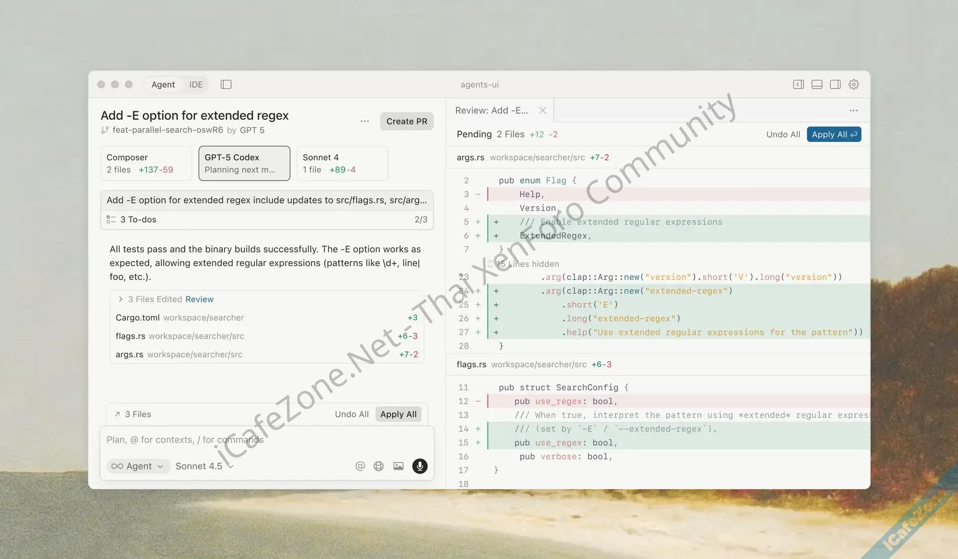 นอกจากโมเดลใหม่แล้ว Cursor 2.0 ยังมาพร้อมกับอินเทอร์เฟซแบบใหม่ โฟกัสที่การทำงานแบบ multi-agent ใช้ agent หลายตัวทำงานแข่งกัน ทำงานขนานกัน โดยไม่ยุ่งกันเอง เพื่อให้ผู้ใช้โฟกัสไปที่ผลลัพธ์ (outcome) มากขึ้น และถ้าต้องการกลับไปดูโค้ดละเอียด ก็สามารถสลับกลับไปยังอินเทอร์เฟซแบบเดิมที่เป็น IDE ได้