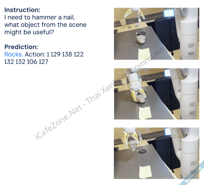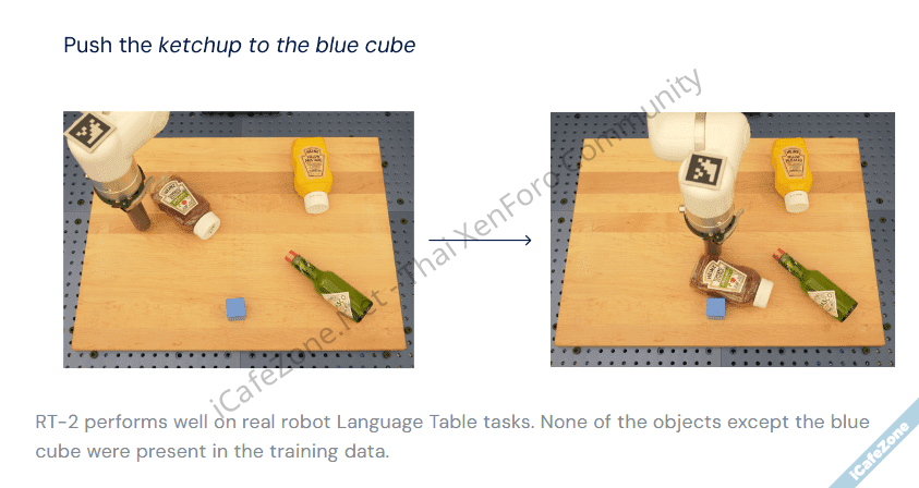 ตัวอย่างเช่น หุ่นยนต์แบบเดิมสามารถเรียนรู้จากการจับวางวัตถุ และทดลองทำซ้ำเรื่อย ๆ จนเข้าใจดี แต่วิธีของ RT-2 จะแตกต่างออกไป หุ่นยนต์สามารถเจอวัตถุที่ไม่คุ้นเคย แต่อาศัยข้อมูลจากอินเทอร์เน็ตมาช่วยทำให้สามารถจับวางวัตถุได้ถูกต้องแม่นยำมากขึ้นแม้เป็นการลองครั้งแรก ช่วยลดเวลาในการเทรนข้อมูลนั่นเอง