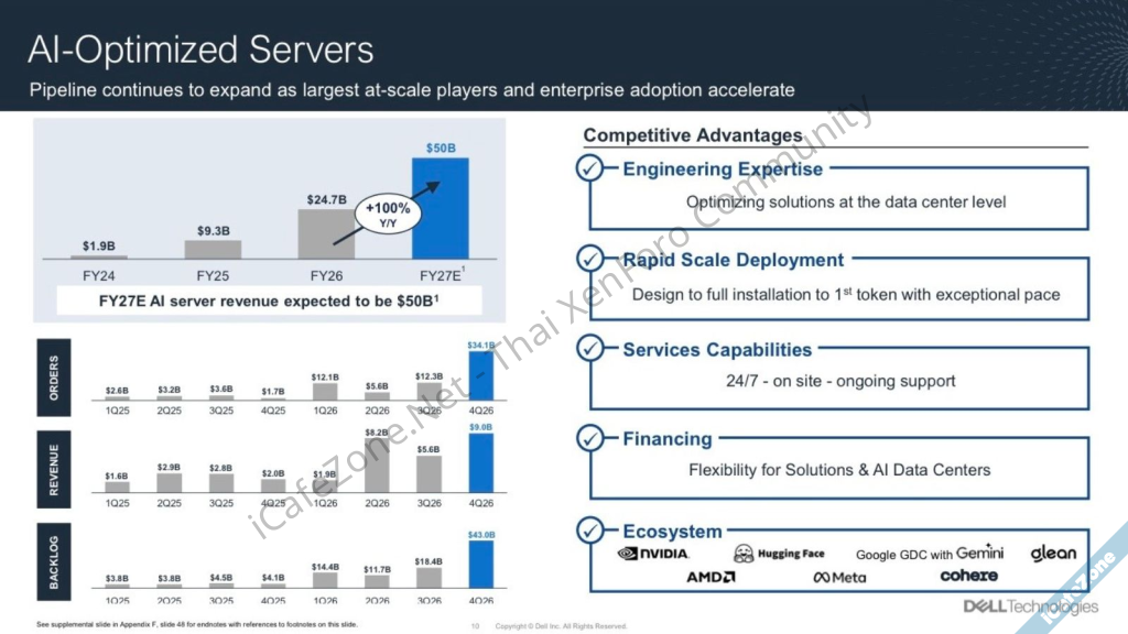 Jeff Clarke รองประธานและซีโอโอของ Dell บอกว่าปีที่ผ่านมาเป็นปีประวัติศาสตร์ของบริษัท จากโอกาสที่เกี่ยวข้องกับ AI มีคำสั่งซื้อเซิร์ฟเวอร์สำหรับ AI รวมกว่า 6.4 หมื่นล้านดอลลาร์ และส่งมอบไปแล้วกว่า 2.5 หมื่นล้านดอลลาร์ แบ็กล็อกเริ่มต้นปีอยู่ที่ 4.3 หมื่นล้านดอลลาร์ เป็นสถิติสูงสุดบริษัท