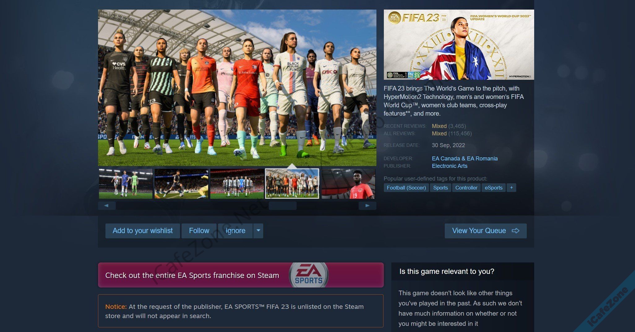 ตอนนี้หากค้นหาคำว่า FIFA บนสโตร์ต่างๆ จะไม่เจอเกมอีกแล้ว แต่ถ้ารู้ลิงก์ตรงไปยังหน้าเพจของเกม (เช่น FIFA 23 บน Steam) ยังสามารถเข้าได้อยู่ แต่ซื้อเกมไม่ได้อีกแล้ว และมีข้อความขึ้นบอกว่าเกมถูกนำออกจากผลการค้นหาตามคำขอโดย EA เอง