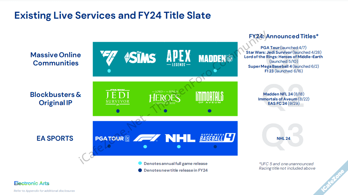 Andrew Wilson ซีอีโอ EA กล่าวว่าในไตรมาสปัจจุบัน และตลอดปีนี้บริษัทยังคงมีเกมเด่นที่จะออกมาต่อเนื่องเช่น Madden NFL 24 และ EA SPORTS FC 24