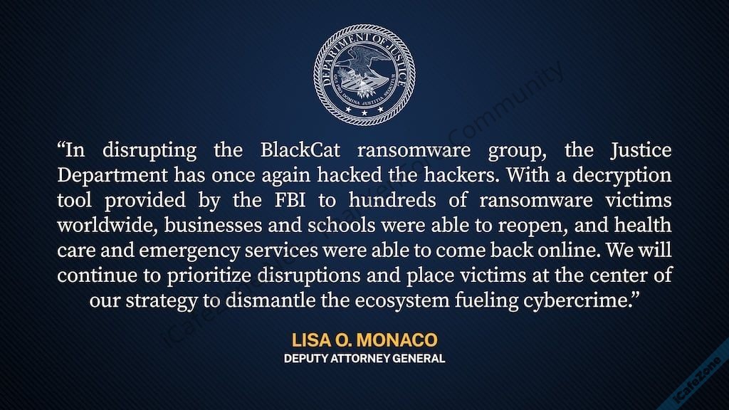 FBI ประกาศความสำเร็จในการแฮกเซิร์ฟเวอร์ของกลุ่ม Blackcat หรือ ALPHV กลุ่มให้บริการมัลแวร์เรียกค่าไถ่ (ransomware-as-a-service) อันดับสองของโลกเมื่อนับตามมูลค่าไถ่ที่เรียกได้ พร้อมกับแจกโค้ดโปรแกรมถอดรหัสแจกจ่ายเหยื่อที่ถูกโจมตีกว่า 500 ราย