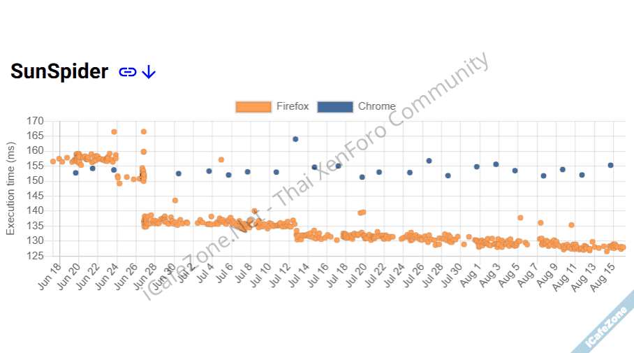 ข้อมูลจากหน้าเว็บ Are We Fast Yet ของทีม Firefox เอง ชี้ว่า Firefox ปรับปรุงประสิทธิภาพของ SunSpider ในช่วงปลายเดือนมิถุนายน 2023 ลดระยะเวลาการรันเบนช์มาร์คลงจากราว 160ms มาเหลือ 135ms และในช่วงล่าสุดขยับได้เกือบ 125ms แล้ว ในขณะที่ Chrome ค่อนข้างอยู่ตัวที่ราว 150-155ms