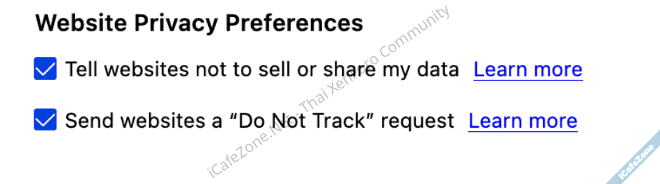 ในหน้าจอตั้งค่าความเป็นส่วนตัว Preferences → Privacy & Security ยังเพิ่มตัวเลือก Website Privacy Preferences แจ้งให้เว็บไซต์ทราบว่าไม่ต้องการให้ขายหรือแชร์ข้อมูลของเรา (แจ้งแล้วเว็บไซต์จะทำตามหรือไม่นั่นอีกเรื่องนึง) โดยการแจ้งเตือนนี้มีชื่อเรียกว่า Global Privacy Control ซึ่งเป็นสิทธิตามกฎหมายคุ้มครองผู้บริโภคของรัฐแคลิฟอร์เนีย