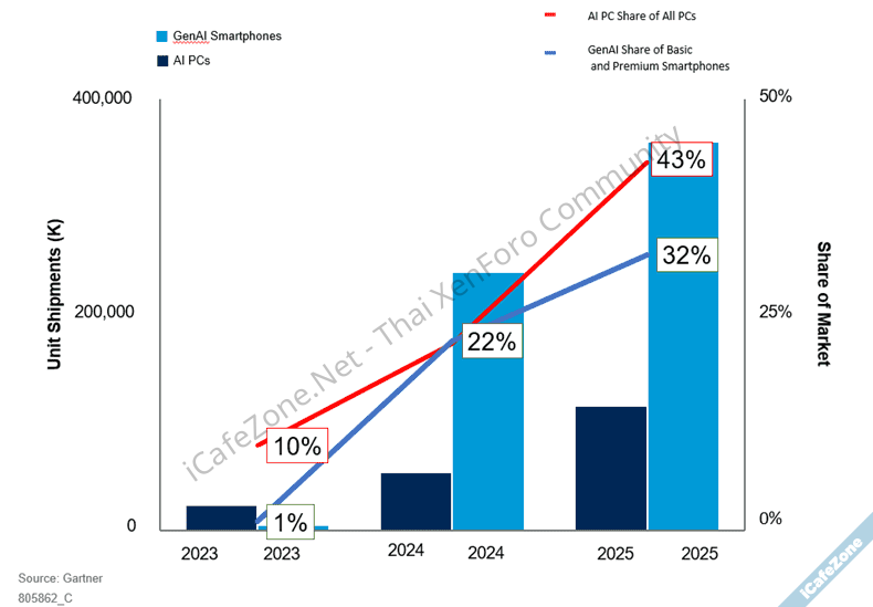 Gartner คาดการณ์ยอดส่งมอบ AI PC และ GenAI สมาร์ทโฟนทั่วโลกในปี 2024 รวมทั้งหมดประมาณ 295 ล้านเครื่อง เพิ่มขึ้นจาก 29 ล้านเครื่องในปี 2023 โดยยอดจัดส่ง GenAI Smartphone จะอยู่ที่ประมาณ 240 ล้านเครื่อง ขณะที่ AI PC จะมียอดจัดส่งที่ 54.5 ล้านเครื่อง คิดเป็นสัดส่วน 22% ของ Smartphone ในระดับพื้นฐานและพรีเมียม และ 22% ของ PC ทั้งหมดในปีนี้