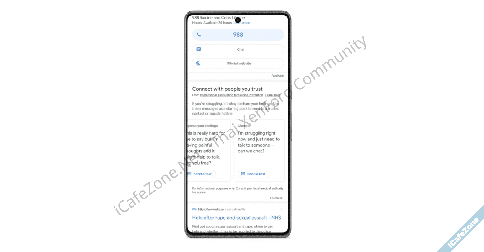 เช่นในสหรัฐอเมริกา กูเกิลจะขึ้นข้อความให้โทรหรือส่งข้อความถึง 988 ติดต่อ Suicide & Crisis Lifeline เพื่อพูดคุยและปรึกษาด้านสุขภาพจิตได้ตลอด 24 ชม. แสดงปุ่มส่งข้อความถึงคนใกล้ชิด โดยจะมีปุ่มส่งข้อความขอความช่วยเหลือที่จะเข้าไปสู่หน้าแอปส่ง SMS เพื่อให้สามารถส่งได้ทันที