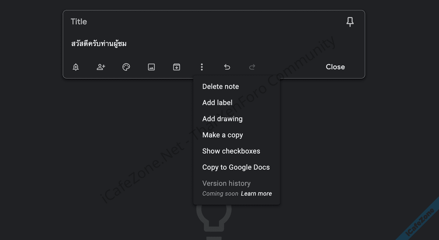 Google เตรียมปล่อยฟีเจอร์ History Version หรือประวัติ ของ Google Keeps บนเว็บไซต์ขึ้นมา ซึ่งจะพบได้ที่เมนู 3 จุดของแต่ละโน้ต แต่ตอนนี้ ยังเป็นสีเทาพร้อมบอกว่า Coming Soon