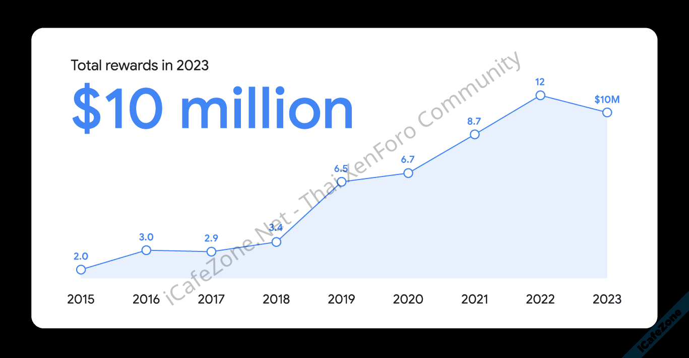 กูเกิลรายงานการจ่ายเงินรางวัล สำหรับผู้แจ้งบั๊กช่องโหว่ของโครงการ Vulnerability Reward Program (VRP) ในปี 2023 โดยจ่ายเงินไป 10 ล้านดอลลาร์ ให้นักวิจัย 632 ราย ใน 68 ประเทศ