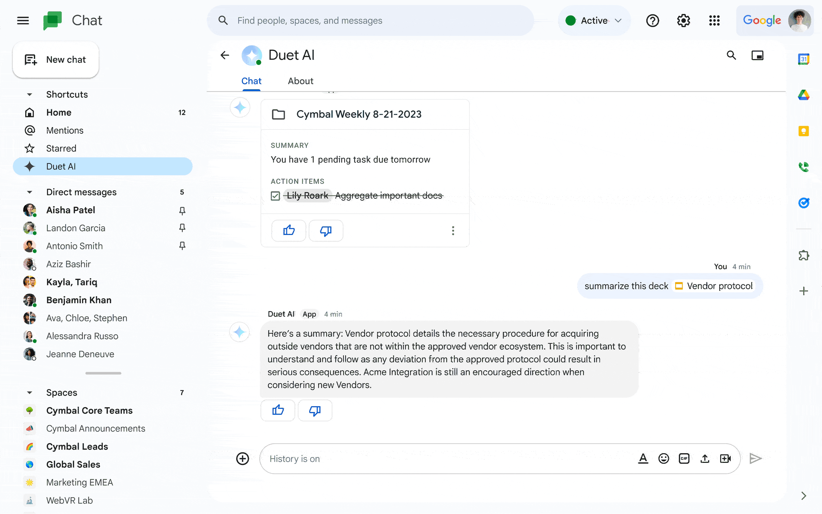 โดย Google Chat จะทำงานโดยมี Duet AI ทำหน้าที่เป็นแชทบอตหนึ่งในลิสต์สำหรับสนทนาโต้ตอบ ซึ่งมีความสามารถช่วยอัพเดต ค้นหาข้อมูล ตลอดจนให้คำแนะนำคำตอบ ผ่านการค้นหาเนื้อหาจากข้อความในอดีต และไฟล์ในแพลตฟอร์ม Google Workspace ซึ่งจะช่วยให้การทำงานต่อเนื่องและมีประสิทธิภาพมากขึ้น