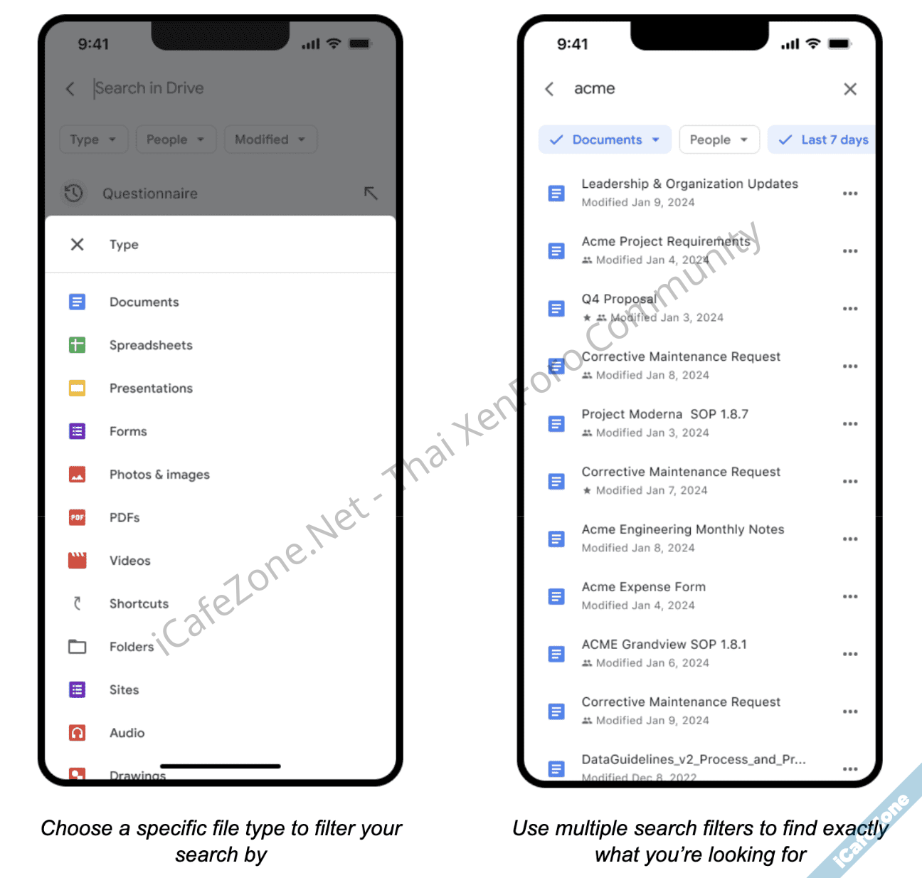 - เสิร์ชใน iOS ปรับปรุงโดยเพิ่มแถบฟิลเตอร์ด้านบน เช่น ประเภทไฟล์ คนที่แชร์ อายุของไฟล์ ทำให้สะดวกในการค้นหาไฟล์ที่ต้องการ (Android จะได้เร็ว ๆ นี้)