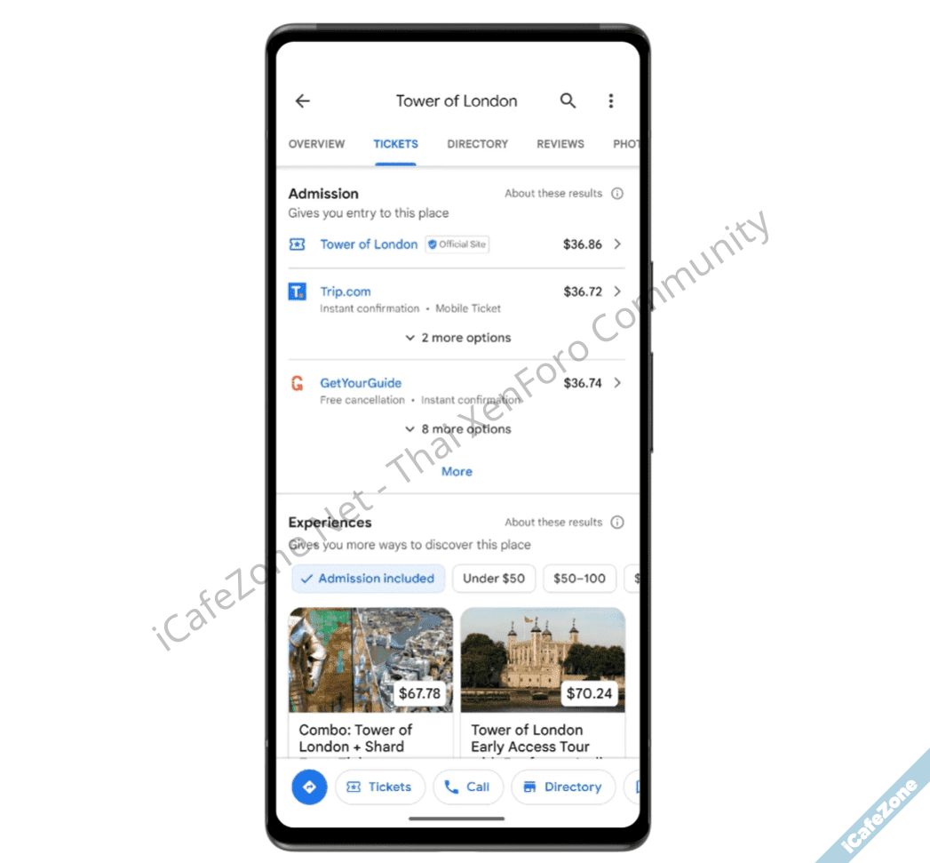 ฟีเจอร์ใหม่อีกอย่างคือแสดงราคาตั๋วเข้าสถานที่ท่องเที่ยวหรือทัวร์บางแห่งได้จาก Google Search/Maps พร้อมลิงก์กดซื้อตั๋วได้เลย