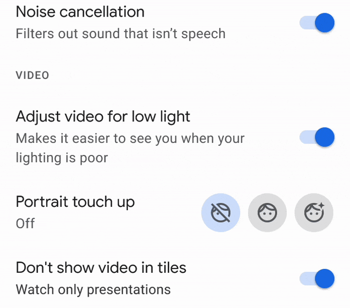 โหมดการใช้งานมีสองระดับคือ Subtle ระบุว่าเป็นการปรับเพียงเล็กน้อย และ Smoothing ที่มีการปรับสภาพใบหน้ามากกว่า กูเกิลอธิบายว่าหลายครั้งเราต้องวิดีโอคอลในสภาพที่อาจจะดูเหนื่อยล้าเกินไป เช่น เพิ่งออกมาจากฟิตเนส เพิ่งหายป่วย หรือเพิ่งกลับจากเดินทางไกล ฟีเจอร์นี้จึงเข้ามาช่วยเพิ่มความมั่นใจและสบายใจกับผู้ใช้งานนั่นเอง