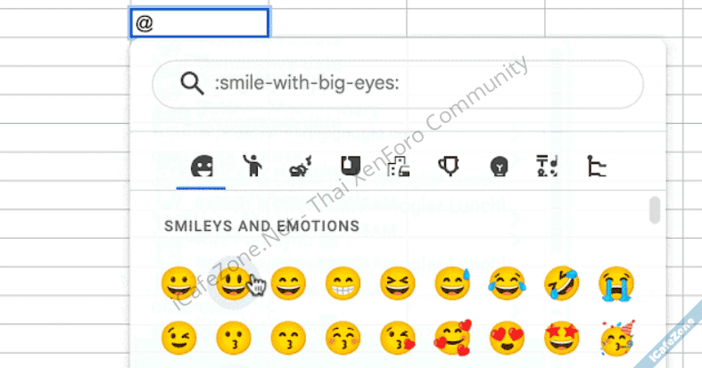 - แทรกอีโมจิใน Sheets ได้ โดยพิมพ์ @ แล้วเลือกหัวข้อ Emoji จากดรอปดาวน์ หรือไปที่ Insert แล้วเลือก Emoji