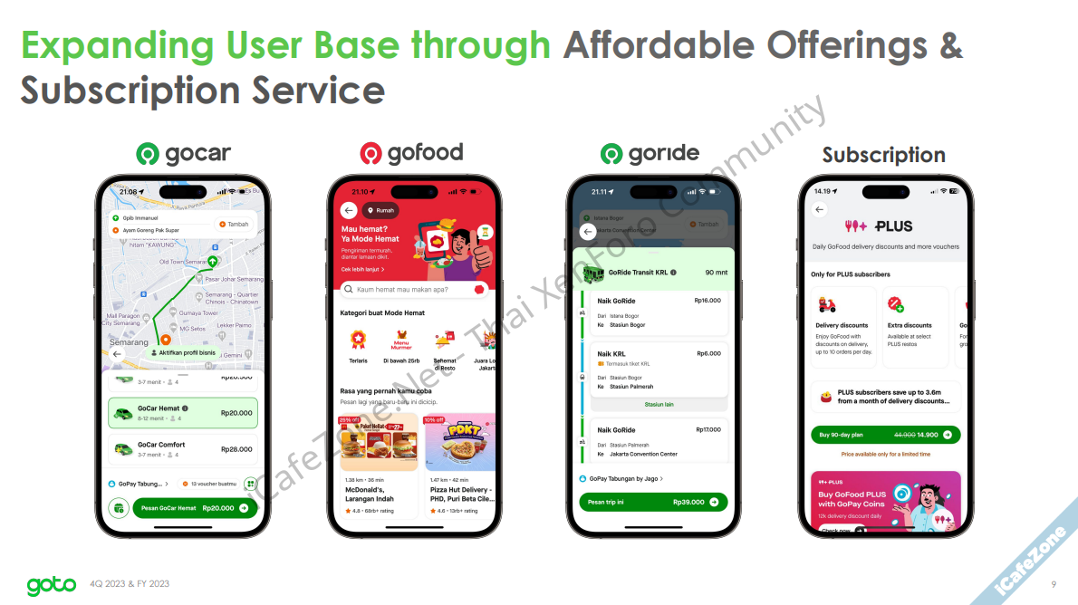 รายได้จากธุรกิจออนดีมานด์ (รถโดยสาร-เดลิเวอรี) เพิ่มขึ้น 4% เป็น 12,109 ล้านล้านรูเปียห์ ส่วนธุรกิจอีคอมเมิร์ซ เพิ่มขึ้น 11% เป็น 9.123 ล้านล้านรูเปียห์ และธุรกิจการเงินเพิ่มขึ้น 15% เป็น 1.878 ล้านล้านรูเปียห์