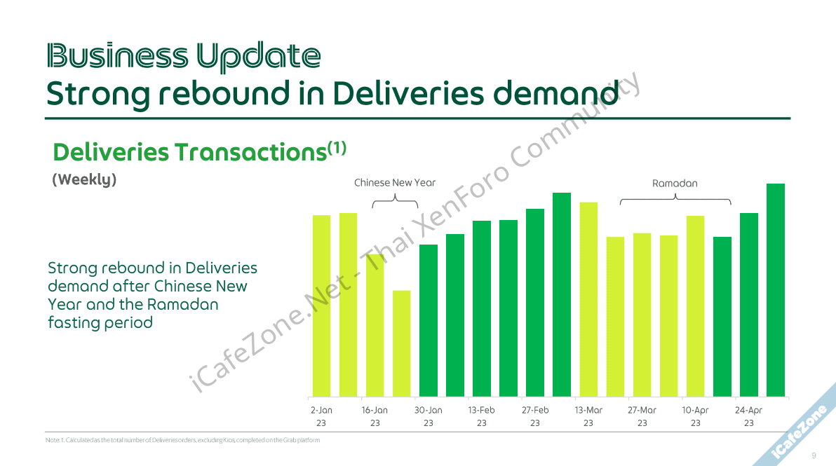 กลุ่มธุรกิจเดลิเวอรีมีรายได้เพิ่มขึ้น 203% เป็น 275 ล้านดอลลาร์ แต่ GMV ลดลง 9% เป็น 2,344 ล้านดอลลาร์ จากการผ่อนคลายของโควิด รวมถึงเดือนรอมฎอนที่เริ่มเร็วขึ้นจากปีก่อน และเทศกาลตรุษจีน Grab ยังระบุว่าแพ็คเกจ GrabUnlimited ช่วยกระตุ้นยอดซื้อได้ โดยพบว่าผู้สมัครมีการใช้จ่ายมากกว่าคนไม่สมัคร 3.7 เท่า