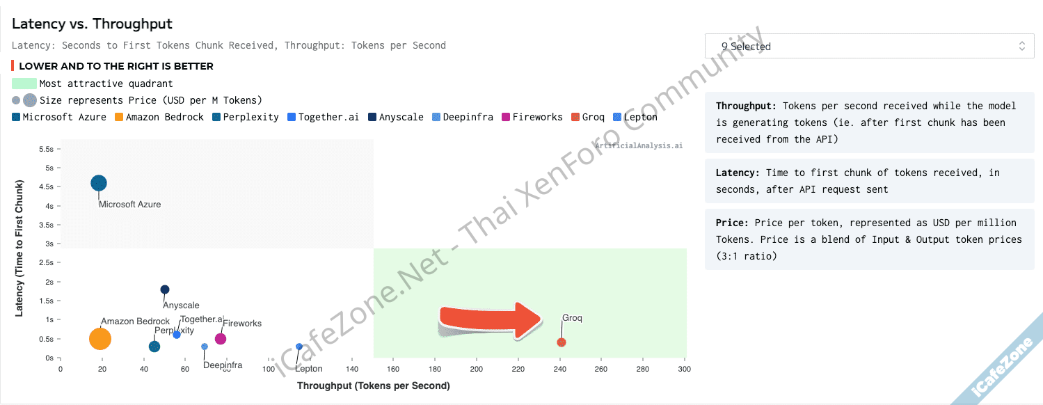 โมเดลที่ใช้ทดสอบเป็นโมเดล Llama 2 70B ที่มีคลาวด์หลายเจ้าให้บริการกัน รวมถึงคลาวด์รายใหญ่อย่าง Amazon Bedrock และ Azure แต่จุดที่ Groq นำมาเน้นคือความเร็วในการตอบ ที่ระยะเวลาจนถึงการตอบ 100 token แรกนั้นกินเวลาเพียง 0.7 วินาที และอัตราการตอบรวมได้เร็วกว่า 240 token ต่อวินาที นับว่าเร็วกว่าคู่แข่งอันดับสองแบบห่างไกล (Lepton รันได้สูงกว่า 120 token ต่อวินาทีไปเล็กน้อย)