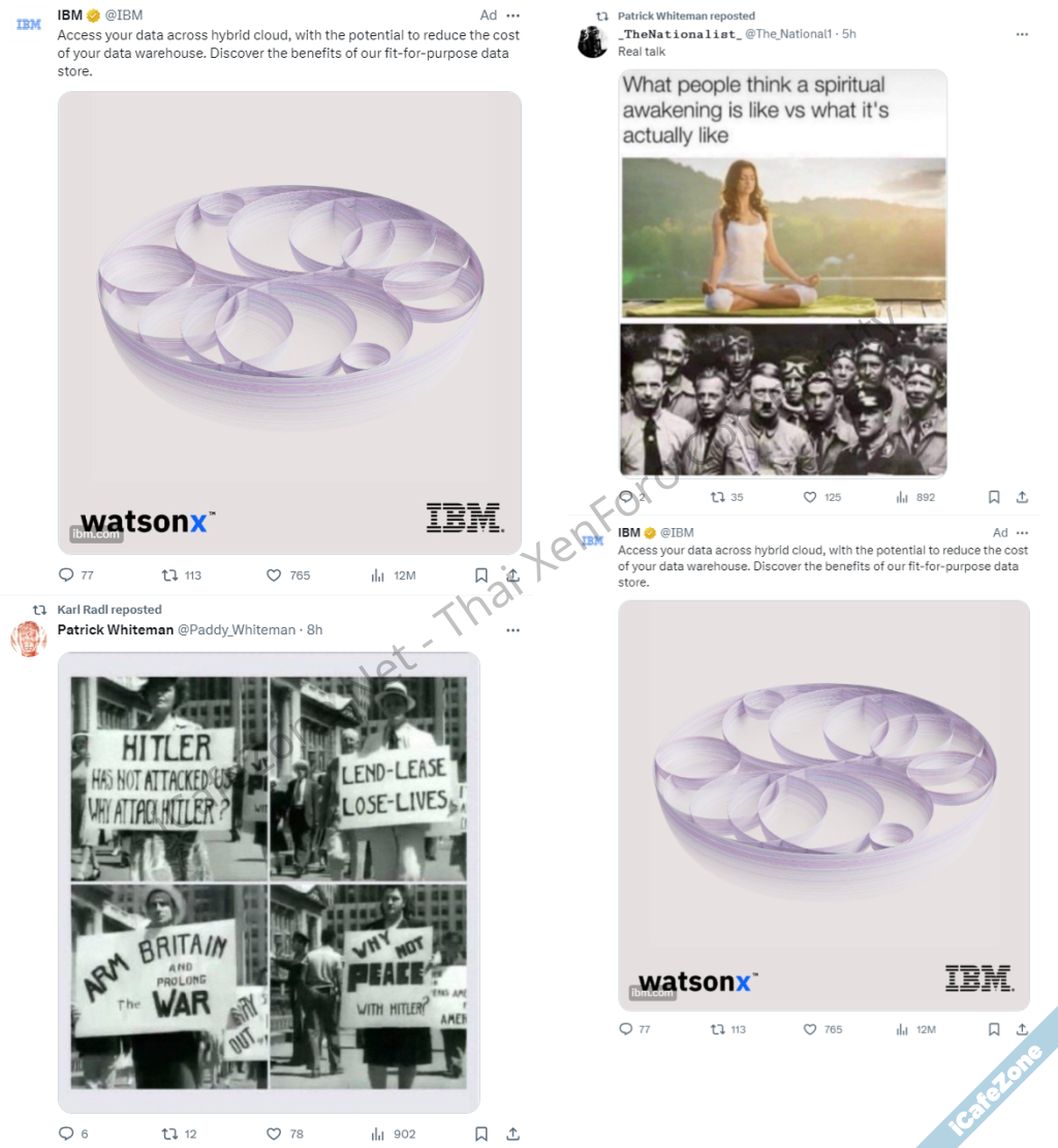 IBM ประกาศถอนตัวการลงโฆษณาบน X หลังจากที่โฆษณาของบริษัทถูกวางไว้ใกล้กับเนื้อหาที่สนับสนุนนาซีบนแพลตฟอร์ม บริษัทกล่าวว่าได้ระงับโฆษณาทั้งหมดจาก X แล้ว หลังกลุ่มเฝ้าระวังที่ไม่แสวงหาผลกำไรอย่าง Media Matters รายงานว่าพบโฆษณาของ IBM และบริษัทด้านเทคโนโลยีอีกหลายแห่ง (Apple กับ Oracle ก็โดน) ถูกวางถัดจากมีมที่สนับสนุนนาซี และโพสต์อื่น ๆ ที่ส่งเสริมฮิตเลอร์