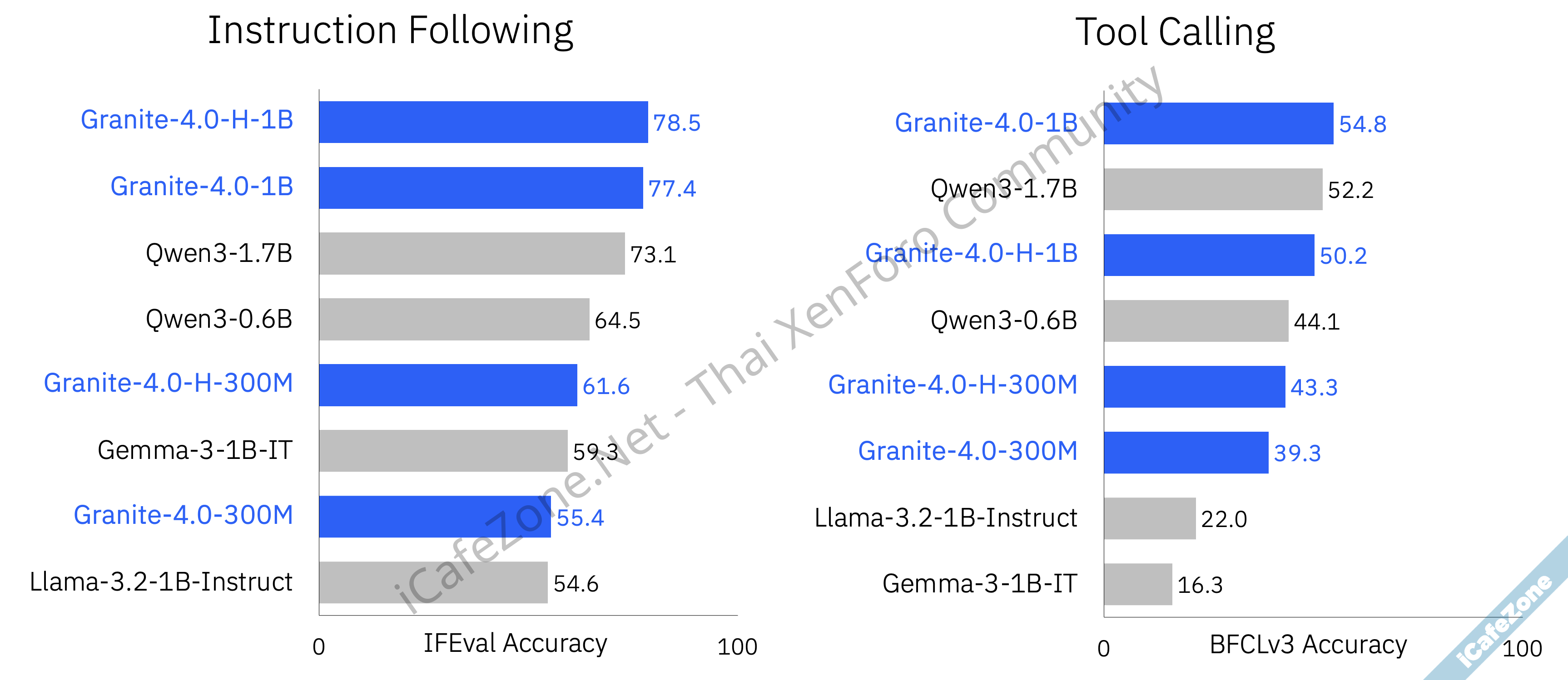 Granite 4.0 Nano มีทั้งเวอร์ชันใช้สถาปัตยกรรมไฮบริด (Mambo+Transformer) และแบบดั้งเดิม (Transformer) สำหรับรันบนสภาพแวดล้อมที่ยังไม่รองรับ Mambo (เช่น Llama.cpp) คู่แข่งของมันในขนาดใกล้ๆ กันคือ Qwen3-1.7B, Qwen3-0.6B, Gemma-3-1B, Gemma-3-270M, Llama-3.2-1B แต่จุดเด่นของ Granite 4.0 Nano คือประสิทธิภาพที่เหนือกว่า ปฏิบัติตามคำสั่งได้ดีกว่า จากผลเบนช์มาร์คที่วัดออกมาได้