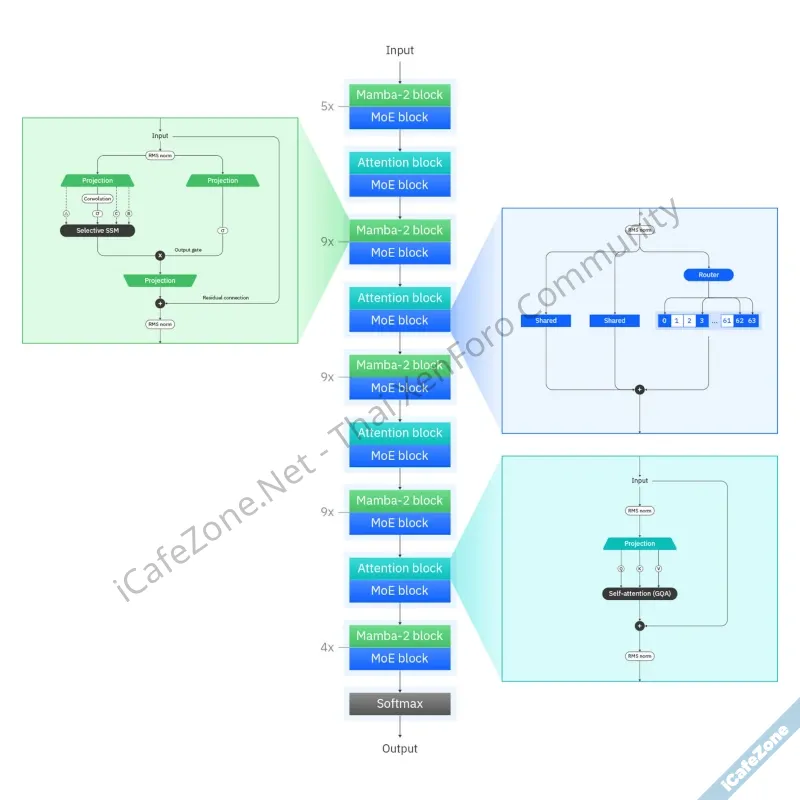 ทีมวิจัยของ IBM นำสถาปัตยกรรม transformer มาผสมกับ Mamba ในสัดส่วน 1:9 รวมข้อดีของสถาปัตยกรรมทั้งสองแบบเข้าด้วยกัน โดยมีบล็อค mixture of experts (MoE) คอยเชื่อมข้อมูลระหว่างบล็อคแต่ละประเภท (ดูภาพประกอบ)