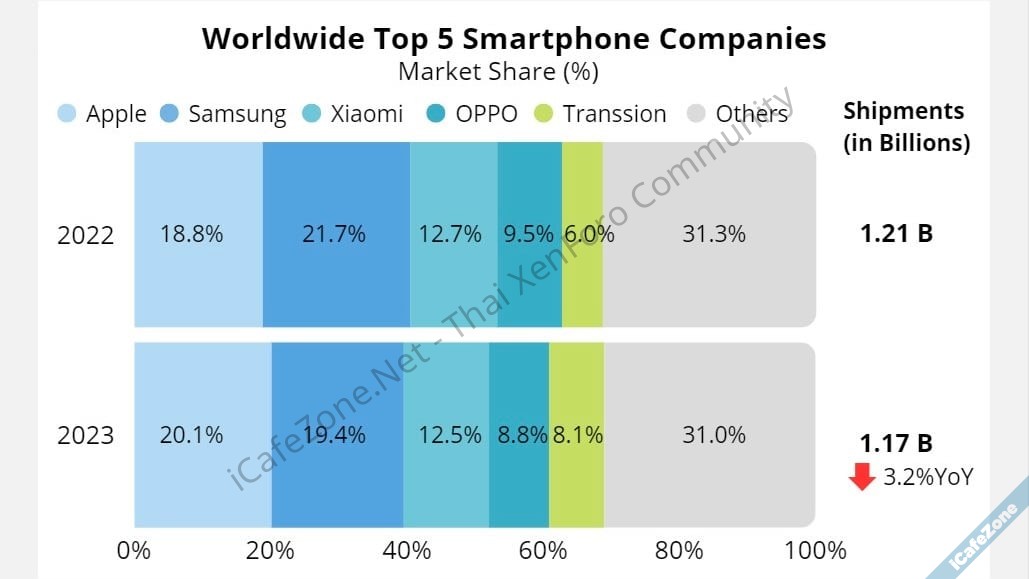 ส่วนแบ่งตลาดสมาร์ทโฟนในปี 2023 อันดับที่ 2-5 ได้แก่ ซัมซุง (19.4%), Xiaomi (12.5%), OPPO (8.8%) และอันดับ 5 คือ Transsion ที่เติบโตโดดเด่นจากปีก่อน (8.1%)