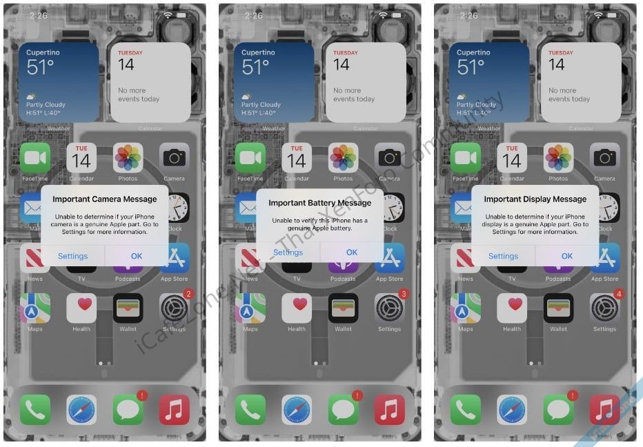 ปัญหานี้เกิดจากการเปลี่ยนอะไหล่ชิ้นส่วน ซึ่งหากร้านซ่อมแซมทั่วไปจะเปลี่ยนให้ ชิ้นส่วนนั้นก็ต้องสั่งซื้อตรงจากแอปเปิล แถมต้องทำการยืนยันการว่ามีการเปลี่ยนเข้าชิ้นส่วนซีเรียลนั้น ๆ เข้าไปใน iPhone เครื่องที่ระบุ ผ่านระบบอนุมัติของแอปเปิลอีกด้วย โดยหากใช้ชิ้นส่วนอื่นหรือไม่ได้ยืนยัน การใช้งานจะปรากฏข้อความเตือนขึ้นมา และอาจใช้งานที่เกี่ยวข้องกับชิ้นส่วนนั้นไม่ได้ด้วย