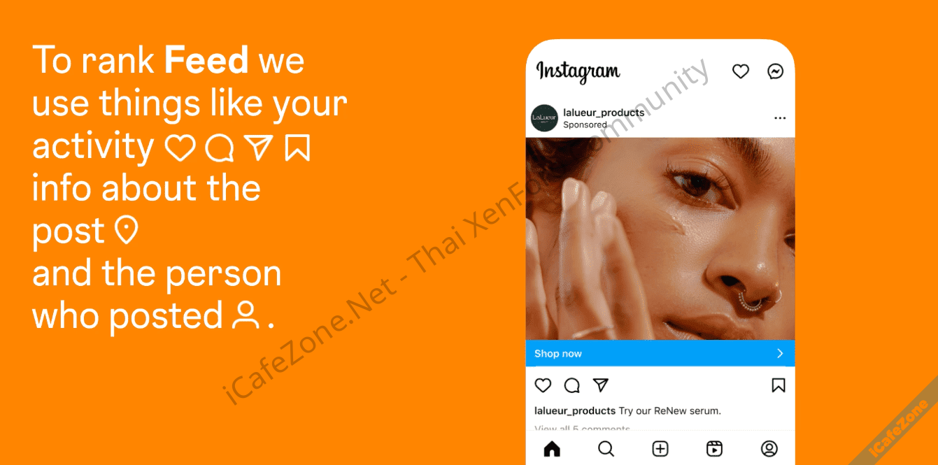 เริ่มที่การคัดเนื้อหาของ Feed ซึ่งมีเนื้อหาจากบัญชีที่ติดตาม เนื้อหาแนะนำที่ Instagram คิดว่าผู้ใช้งานชอบ และโฆษณา โดยการแสดงเนื้อหา จะให้น้ำหนักโพสต์ล่าสุดจากบัญชีที่ติดตาม ผสมกับโพสต์จากบัญชีที่ไม่ได้ตาม แต่ Instagram คิดว่าเราสนใจ โดยดูข้อมูลทั้งบัญชีที่ตามปัจจุบัน โพสต์ที่ไลค์หรือคอมเมนต์ ประเภทโพสต์ที่สนใจก็ส่งผลต่อการเลือกเนื้อหามาแสดง เช่น ถ้าเราชอบกดไลค์รูปภาพ โพสต์ที่เป็นภาพนิ่งก็จะแสดงมากกว่าวิดีโอ Instagram ยังประเมินจากข้อมูลเนื้อหาที่อยู่ในโพสต์นั้นด้วย