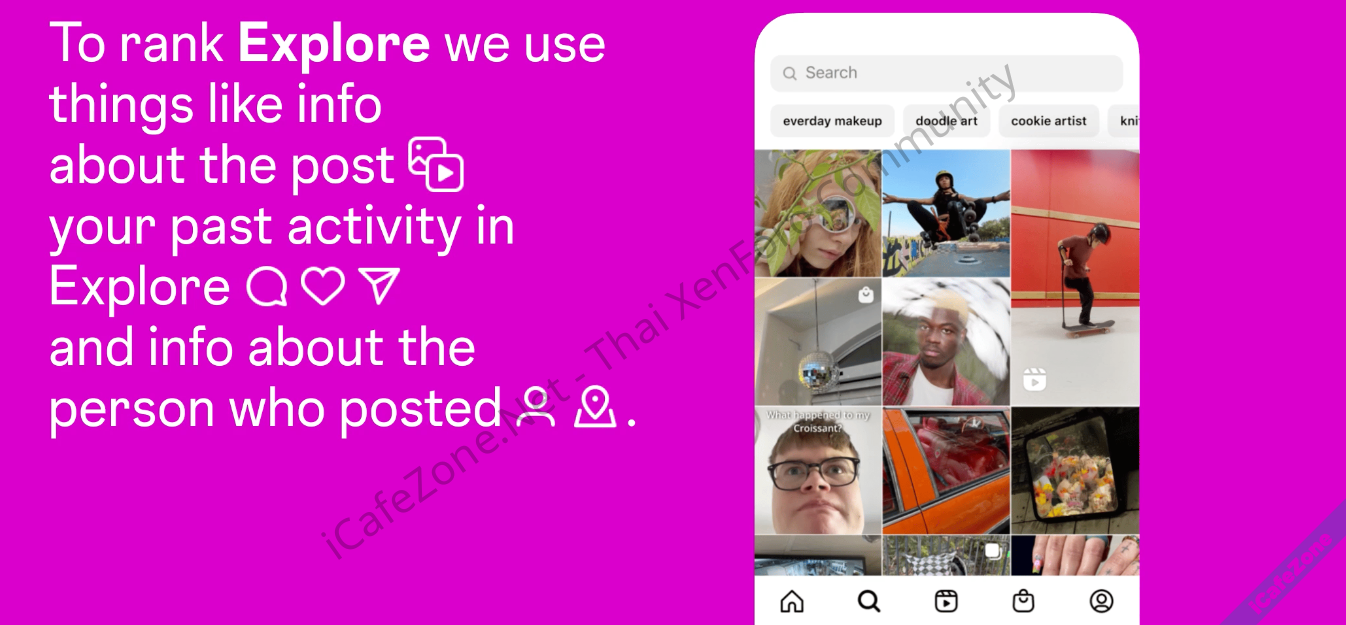 ส่วนของ Explore เนื่องจากต้องการให้ผู้ใช้งานค้นพบเนื้อหาใหม่ จึงอาศัยการจัดอันดับโพสต์ทั้งรูปภาพและวิดีโอที่เราน่าจะสนใจ แล้วเลือกการแสดงผลโดยดูจาก ข้อมูลในโพสต์ที่ตรงกัน, พฤติกรรมในอดีตที่ใช้ Explore ว่าชอบกดดูต่อในคอนเทนต์ไหน ตลอดจนการโต้ตอบกับโพสต์ที่ค้นพบนั้น