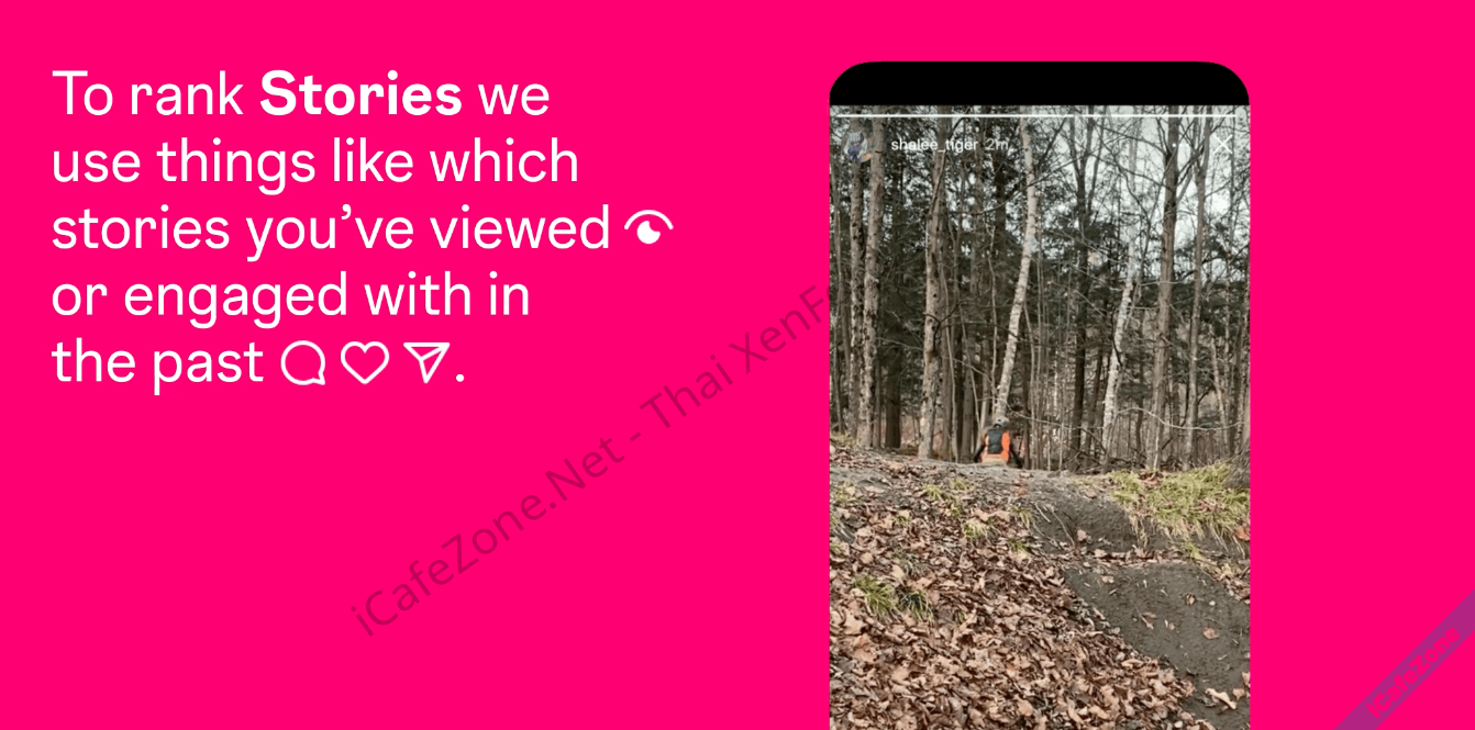 มาที่ Stories ตัวสัญญาณที่ใช้หลักได้แก่ ประวัติการดู Stories ของแต่ละบัญชี ถ้าบ่อยก็จะแนะนำขึ้นมาก่อน, การโต้ตอบกับสตอรี่ เช่น ไลค์หรือ DM และดูความสัมพันธ์ หากเป็นเพื่อนหรือคนในครอบครัว ก็จะให้น้ำหนักมากขึ้น