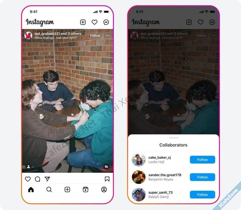 ถัดมาเป็น Collab ที่โพสต์สามารถแชร์ไปยังฟีดของคนที่ติดตามแต่ละบัญชีได้พร้อมกัน โดยในหนึ่งโพสต์สามารถเพิ่มเพื่อนมา collab กันได้อีก 3 คน (รวมเป็น 4) ซึ่งรองรับแม้กรณีเป็นบัญชี Private